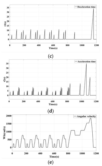 Parameter plot over time. (a) Vehicle speed, (b) Vehicle acceleration, (c) Deceleration duration, (d) Acceleration duration, (e) Angular speed of right drive half shaft.