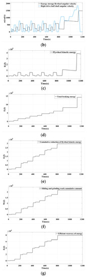 Simulation result graph. (a) State diagram of magnetic coupling transmission mechanism, (b) Angular velocity diagram of energy storage flywheel and right transmission half shaft, (c) Kinetic energy variation diagram of energy storage flywheel, (d) Vehicle braking energy accumulation diagram, (e) Accumulation diagram of kinetic energy reduction of energy storage flywheel, (f) Sliding wear work accumulation diagram, (g) Effective energy recovery.