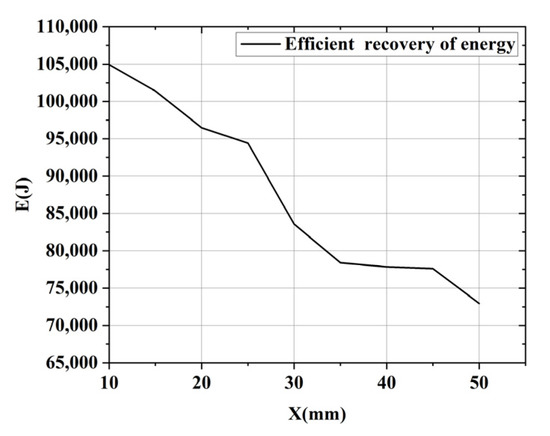 The magnetic ring is moved from 10 mm to 50 mm, with an interval of 5 mm, and the influence of the magnetic ring on the braking energy recovery effect at different positions is further analyzed. The results are shown in Figure 17.