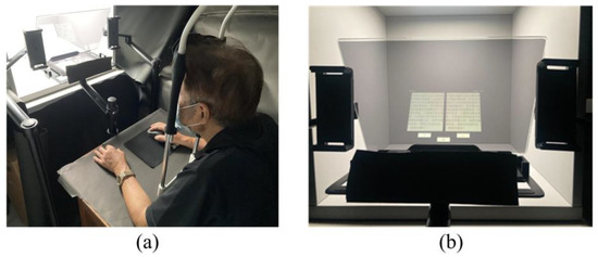 Although some related works focused on improving visibility [24], studying the characteristics [25], and finding the preferences of the tone reproduction curve [26] for transparent LCD and OLED under various ambient lighting conditions, there were still a few studies that aimed for a HUD, whose display theory and application were slightly different from those devices. In our previous study, a psychophysical experiment was conducted to investigate the visual clarity of a HUD with different text-background lightness combinations under dark and 15,000 lx lighting levels. The results suggested the white text with a black background and the black text with a white background could approach the best visual clarity for the two conditions, respectively. To establish a comprehensive study associated with this topic and an evaluation model, more illuminance levels and different age groups needed further investigation [27]. Based on the above reason, a psychophysical experiment was conducted in this study to investigate the visual clarity of a HUD with the various text-background lightness combinations under daylight and dark conditions for better enhancing its visual perception.