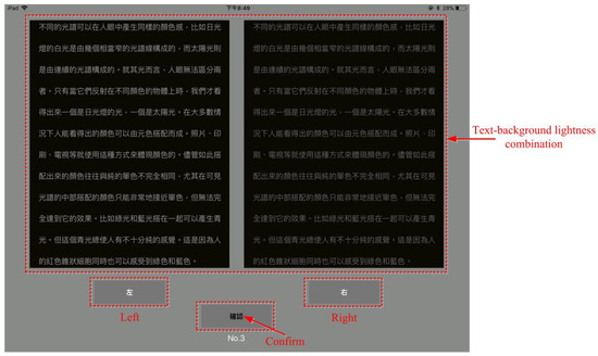 The RGB values of the iPad are adjusted to produce five achromatic colors for different background lightness. Totally 20 text-background lightness combinations are acquired from these five colors, using one for the text and one of the others for the background. These 20 combinations are presented to observers as paired comparisons for estimation, as shown in Figure 3, for a total of 190 pairs. Each observer assesses 20 of the 190 pairs twice for verification. Thus, each observer evaluated the 210 pairs on the head-up display (projected from the iPad) under four illuminance levels. For obtaining accurate colorimetric characteristics under each illuminance level, a calibrated spectroradiometer is placed at the observer’s eye position to measure the five achromatic colors displayed on the head-up display. The colorimetric information for the four illuminance levels and five achromatic colors is listed in Table 2 and Table 3 for dark, 300, 1500, and 9000 lx surround conditions at 6500 K, respectively.