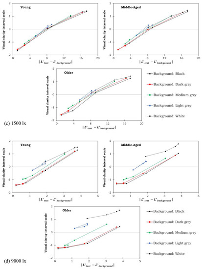 The influence of positive and negative contrast on the observers’ response to the visibility is discussed. The results are shown in Figure 5. Due to the high correlation and the similar trend of the experimental results between the different age groups, the data with the lowest correlation, in which the illuminance level is 9000 lx, is discussed for the older observers. According to Figure 5a, a higher positive contrast (i.e., the text is darker than the background) is better to improve the visual clarity for the white and light gray backgrounds under the dark surround condition. However, a negative contrast (i.e., the text is brighter than the background) is beneficial to the increase in visual clarity for the rest of the three backgrounds.