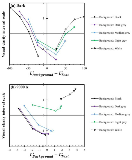 From Figure 5b, a higher positive contrast can approach the highest scale value of visual clarity with the white background under the 9000 lx lighting condition. This finding is much more significant compared to the dark surround condition. Furthermore, it can be found that the positive contrasts are appropriate for backgrounds with higher luminance, such as the white and light gray backgrounds. In comparison, the backgrounds with relatively lower luminance, such as black, dark gray, and medium gray, need apparent negative contrast to increase the legibility of the text under these two ambient lighting conditions.