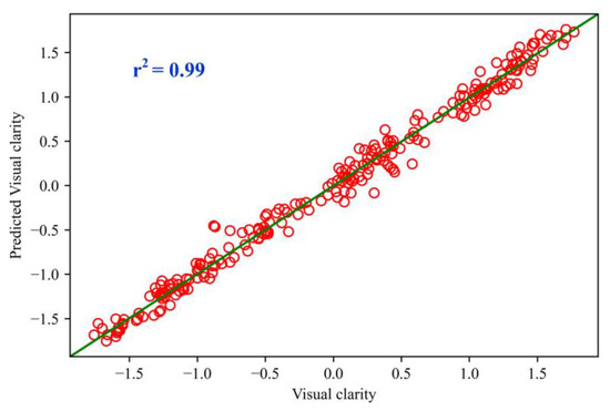 Three evaluation metrics, including the coefficient of determination (r2), mean absolute error (MAE), and root mean square error (RMSE), are commonly used to evaluate a machine learning model’s performance for a regression problem. Figure 7 shows the scatter plot of the predicted values against the ground truth. According to the results, the visual clarity scale obtained from the observers can be well predicted with a high R-squared and low RMSE and MAE, where the values are 0.99, 0.11, and 0.08, respectively. The testing results are listed in Table 5. Additionally, the model shows a high correlation coefficient, and Pearson’s r value is 0.99. The models can be further applied to the AR industry and its manufacturer for developing an advanced HUD with real-time enhancements corresponding to the changes in luminance caused by driving conditions.