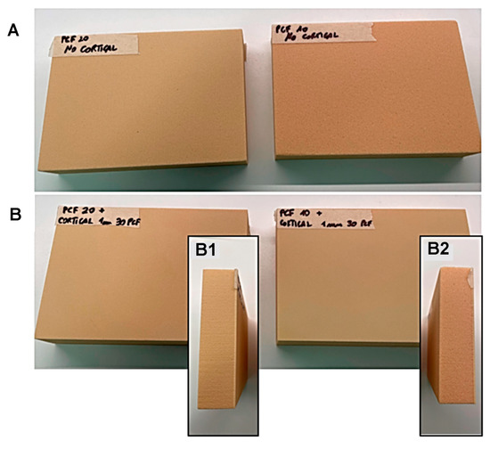 Details of 20 pounds per cubic foot (PCF) (on the left) and 10 PCF (on the right) density blocks, (A) without or (B,B1,B2) with a 30 PCF density cortical sheet, used in the in vitro simulation.