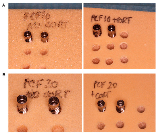 (A) Magnifications of both the tested implants inserted in the 10 PCF density (on the left) and the 10 PCF density with a 30 PCF density cortical sheet (on the right). (B) Magnifications of both the tested implants inserted in the 20 PCF density (on the left) and the 20 PCF density with a 30 PCF density cortical sheet (on the right).