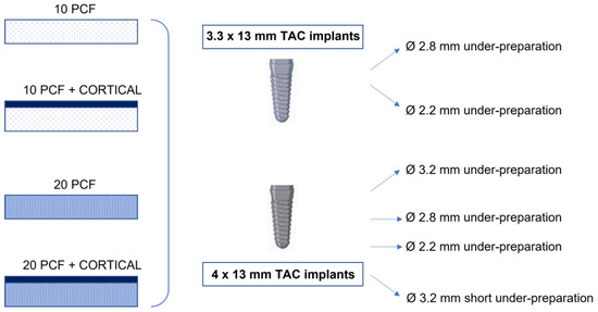 Thus, 10 implants of each type were inserted in 10 and 20 PCF density blocks with or without the addition of a cortical sheet and for each under-prepared site. In this way, a total of 240 site preparations were performed (Figure 6 and Figure 7).