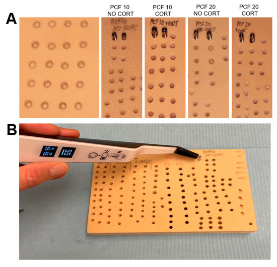 As Comuzzi et al. [27] previously reported, nowadays, the solid rigid polyurethane foam represents the most suitable model to perform in vitro tests and to compare dental implants and bone screws in order to simulate different densities and consistencies of the natural bone. In this study, 13 cm × 18 cm × 4 cm blocks with 10 and 20 PCF in density (which correspond to a density of 0.16 and 0.32 g/cc, mimicking the in vivo D3 and D2 bone, respectively, according to Misch classification [31]), with or without the addition of a 1 mm thickness cortical sheet of 30 PCF in density (corresponding to a density of 0.48 g/cc, similar to the in vivo D1 bone and simulating a layer of cortical bone), were used to test the implants in the present study (Figure 1 and Figure 2). The microstructure of these materials has been previously analyzed [32,33].