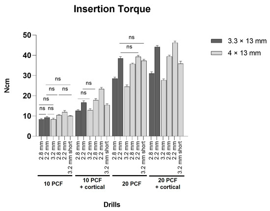 The IT values appeared to be directly proportional to the density of the blocks: lower values were registered in the 10 PCF density block without the cortical sheet, with the lowest IT values of 8.36 ± 0.52 Ncm for 4 × 13 mm TAC implants with the 3.2 mm site preparation protocol, while higher values were found in the 20 PCF density block with the cortical sheet, with the highest values of 46.21 ± 0.79 Ncm for 4 × 13 mm TAC implants with the 2.2 mm site preparation protocol. Thus, the IT values appeared to proportionally increase with the decrease in the under-preparation size of the sites, showing the highest values with 4 × 13 mm implants and 2.2 mm burs in all the experimental conditions (23.34 ± 0.79 Ncm and 11.88 ± 0.86 Ncm in 10 PCF density blocks with and without the cortical sheet, respectively, and 46.21 ± 0.79 Ncm and 39.28 ± 0.68 Ncm in 20 PCF density blocks with and without the cortical sheet, respectively), always reaching a statistical significance, except when compared with 3.3 × 13 mm implants and 2.2 mm protocol in the 20 PCF density block without the cortical sheet. The IT increased about 7–10 points for each decrease in diameter of the under-preparation, except in the lowest densities of the material, where the increase was about 2–5 points in the 10 PCF density block with the cortical sheet and 1–2 points in the 10 PCF density block without the cortical sheet. Indeed, all implants presented quite low IT values in the 10 PCF density block without the cortical sheet, despite the under-preparation size (7.8–12.9 Ncm) (Figure 8).