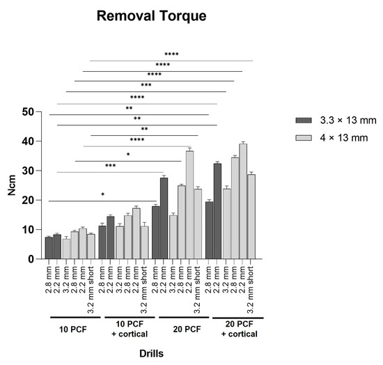 Moreover, RT values reported for the two implants with all the under-prepared sizes in 20 PCF density blocks were significantly higher than the corresponding ones registered in the lowest-density block, with the exception of 4 × 13 mm TAC implants and the 3.2 mm bur in the 20 PCF density block without the cortical sheet.