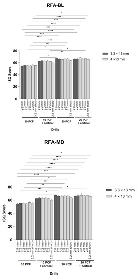 In particular, both 4 × 13 mm and 3.3 × 13 mm TAC implants inserted in the 20 PCF block with the cortical sheet using all the under-preparation protocols exhibited significantly higher RFA values in respect to the corresponding ones inserted in the 10 PCF block without the cortical, except for the 4 × 13 mm TAC implant and the “short” protocol in the 20 PCF density block without the cortical sheet. Additionally, 3.3 × 13 mm TAC implants inserted in the 20 PCF density block without the cortical sheet showed a significantly higher ISQ also in respect to the corresponding implants inserted in the 10 PCF density block with the cortical sheet (Figure 10).