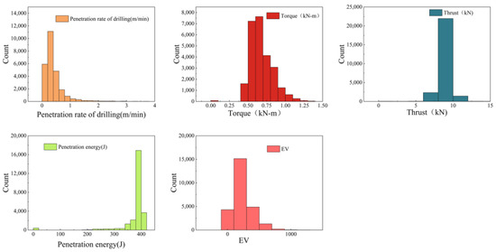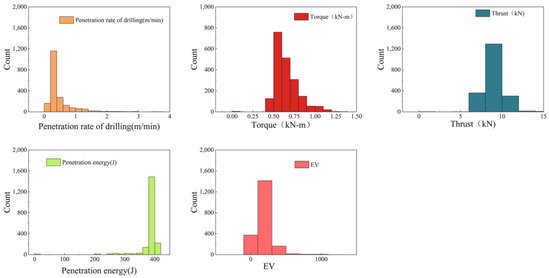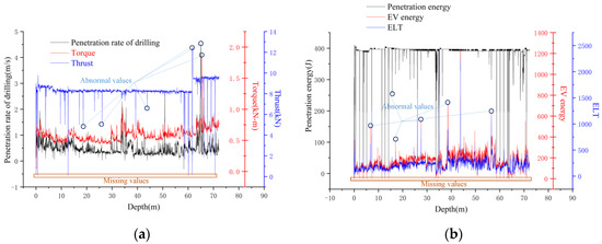MWD data were collected from various sensors during drilling on the KOKEN RPD-180CBR multifunction rig. The monitored parameters included drilling time, depth, torque, number of rotations, thrust, percussive force, beat number, water-supply rate, water-supply pressure, drainage rate, and drainage pressure. In addition, the penetration rate of drilling, penetration energy, EV energy, and ELT were calculated using the monitored parameters. Surrounding rock classes were also recorded. The recorded major drilling parameters are listed in Table 1; these data were recorded at fixed depth intervals to compose the depth-sequence MWD data. The typical monitoring results of some drilling parameters are shown in Figure 1.