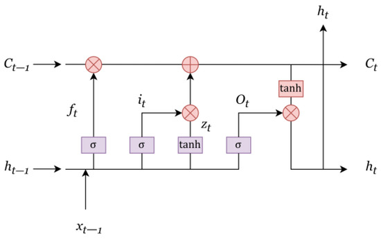 The LSTM neural network was proposed by Hochreiter and Schmidhuber [31] and its structure is illustrated in Figure 3; it adds input, forget, and output gates to the RNN. In this way, disturbing information is eliminated, and the recursive processing of data is selectively performed based on the time or space sequences, thereby solving the problem of gradient disappearance or gradient explosion caused by the traditional RNN. The parameters of the input, forget, and output gates (, , and , respectively) are updated according to Equations (5)–(10) in the following manner.