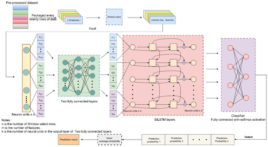 The final layer is located after the BILSTM layer (Figure 5b). The activation function is the ‘Softmax’ function; it outputs the BILSTM-prediction result in the form of probability.