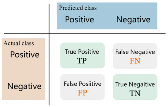 Accuracy is the most intuitive and commonly used metric for assessing model performance; however, it tends to ignore the effects of unbalanced datasets and skews toward the majority class of the sample, thereby resulting in incorrect evaluations [33]. Therefore, to accurately evaluate the model’s predictive performance for unbalanced samples from different perspectives, we used the accuracy, precision, recall, F1 values, and area under curve (AUC) of the receiver operating characteristic curve (ROC) to evaluate the model. These evaluation metrics are based on the confusion matrix shown in Figure 8 and classify the prediction results into four cases.