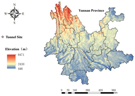 The tunnel is located in Yunnan, China, as shown in Figure 9. The left side starts and ends at pile numbers K281 + 506 and K289 + 090, respectively, and is 7560 m long; the right side starts and ends at pile numbers K281 + 530 and K289 + 103, respectively, is 7597 m long, and passes through 11 fault fracture zones. The geological setting of the tunnel-site area is shown in Figure 10, with various adverse geological bodies being widely distributed along the tunnel route.