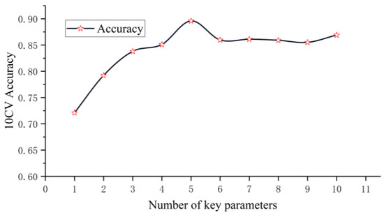 The subsequent optimal deep neural network model with optimal hyperparameters was utilized to develop the 10-fold cross-validation mean accuracy with different numbers of key drilling parameters (Figure 12). The highest accuracy was achieved for the five key drilling parameters, which were selected by Kendall coefficient. The result illustrates the rationality of the key parameters selection method.
