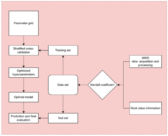 For machine learning, the data determines the upper limit of the model [29,30]. Datasets obtained in practice are usually small and unbalanced, thereby resulting in overfitting; therefore, training the optimal model with limited data while avoiding overfitting is key. Here, the stratified K-fold cross-validation method was used to divide the training set into K parts, of which K − 1 parts were used for model training and one part was used as a validation set. The validation set was not involved in training and was used for cross-cycle validation in the model, i.e., cycling K times to adjust the parameters and evaluate the model. The workflow is shown in Figure 2. Regarding the unbalanced distribution of samples of different rock classes in the dataset, random division may aggravate the unbalance; hence, the stratification method was used to pass the labels of the rock classes in the division and ensure that the proportions of samples of different rock classes in the training and validation sets are the same as that of the original data, thereby reducing adverse effects.