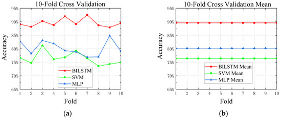 Figure 16 shows the workflow of the rock-mass classification prediction for each model. We selected the optimized hyperparameters using the grid-search method [36] to ensure that the resulting hyperparameters are the best possible. Accuracy was used as the evaluation metric to perform hyperparameter tuning based on the stratified 10-fold CV. The tuning results are shown in Table 6, with parameters not marked being the default values. The stratified 10-fold CV accuracies of the three methods are shown in Figure 17a; the mean accuracy is shown in Figure 17b, from which it can be seen that the model accuracies were BILSTM > MLP > SVM, indicating that the BILSTM model had the best ability to identify the surrounding rock classes.