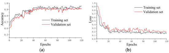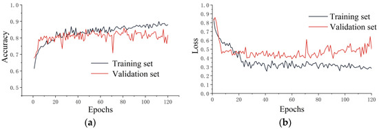 Accuracy and Loss curves on training set and validation set of BILSTM-based deep neural network. (a) Accuracy curve and (b) Loss curve.