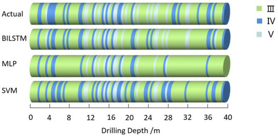 The performance and prediction results of each model were quantitatively evaluated and compared using the evaluation metrics in Section 3.2. The results of each evaluation metric are shown in Table 7, where the following can be seen: (1) All metrics of the BILSTM model were higher than those of the other two models; hence, the BILSTM model exhibited better prediction ability, with the values of each metric being = 0.900,, and . (2) For the prediction of a certain class of surrounding rock, the BILSTM model exhibited excellent performance. Taking class V surrounding rocks as an example, we considered the precision, recall, and F1 metrics together. Regarding precision, the BILSTM model had 0.889, while the MLP and SVM models had 1.000; regarding recall, the BILSTM model had 0.889, while the MLP and SVM models had 0.722 and 0.611, respectively; regarding the F1 value, the BILSTM model had 0.889, while the MLP and SVM models had 0.839 and 0.759, respectively. Combining the results of the three metrics, even though the precision of the BILSTM model was lower than those of the MLP and SVM models, it can still be concluded that the prediction ability of the BILSTM model for class V surrounding rocks was better than those of the MLP and SVM models.