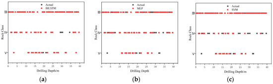 The model with the highest accuracy in the 10-fold model was used as the prediction model. Based on the results shown in Figure 17a, the BILSTM, MLP, and SVM selected the fold7, fold9, and fold3 models as rock-class prediction models for the test set. Figure 18 and Figure 19 illustrate the training processes for the prediction models of BILSTM and MLP, respectively. From the figure, it can be seen that the accuracy and loss curves of the BILSTM were stable, indicating that the BILSTM model proposed in this paper was reliable without overfitting; the curve of the MLP was not so stable and the loss curve of the validation set had an upward trend at the end, and there were overfitting phenomena. The actual rock classes for the test set and the prediction results of the three methods are shown in Figure 20; scatter plots are shown in Figure 21.