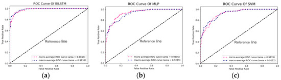 Macro–micro average ROCs: (a) BILSTM, (b) MLP, and (c) SVM.