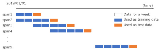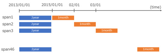 The training data were acquired from 1 January 2013 to 1 January 2015. The test data for each span were shifted by one month from 1 January 2015 to examine the change in accuracy up to span 46 (Figure 5).