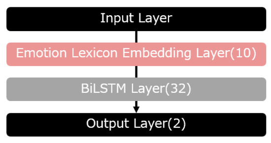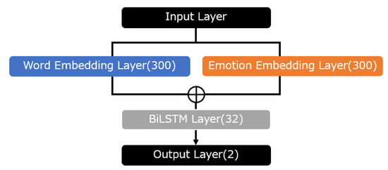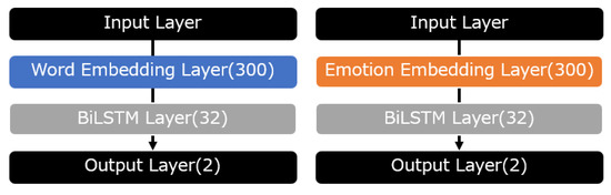 In this study, in the embedding layer of the BiLSTM model [21] used by Aso et al., we cite a model using only GloVe, a model using only emotional GloVe, and a model using both GloVe and emotional GloVe for comparison. The structure of BiLSTM with GloVe or emotional GloVe is shown in (Figure 2). Here, these models are referred to as the “word model” and “emotion model”, and are denoted as “word” and “emo”, respectively, in the graphs.