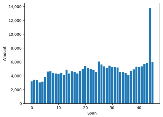 Here, the ratio of labels between the training and test data for each span were adjusted so that the ratio of True:False was 4:1. Approximately 70,000 training data points were obtained. The number of test data in each span are as follows (Figure 6).