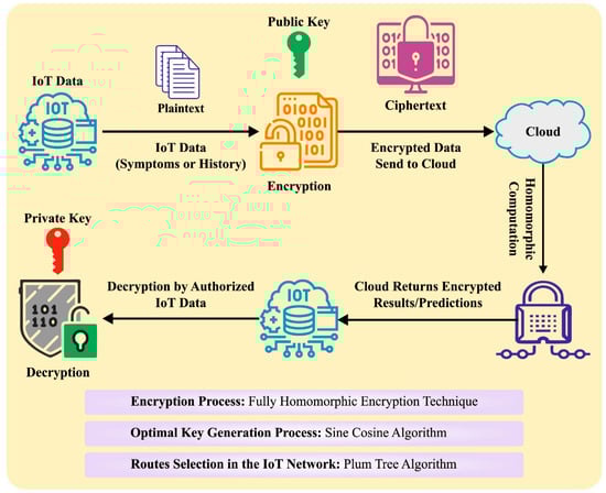Choudhury et al. [] present a DTLS (Datagram Transport Layer Security)-based SGC technique. The presented technique was scalable, lightweight, and robust against member compromise. In addition, the presented method verifies all the group members and is also appropriate for dynamic groups. Wang et al. [] present a novel method to offer FHE service, namely by utilizing garbled circuits. From a high-level perspective, garbled circuit and FHE both function by executing difficult computations on the ciphertext. The author determines a novel cryptographic primitive termed reusable garbled gate that develops in the region of garbled circuits; afterwards, dependent upon this novel primitive, the author depicts that it is very simple to construct FHE. Naresh et al. [] presented a BC-IOTA sharding-based smart contract-centric group key agreement (GKA) for SGC in a huge VANET. In the elliptic curve decision Diffie–Hellman (ECDDH) and group-elliptic curve Diffie–Hellman (GECCDH), the presented method was established to be secure. Raj et al. [] concentrated on website page dataset security with the support of optimizer and encrypted approaches for Web of Things platforms. Primarily, the chosen queries from the webpage application can be introduced as a Discrete Bee Colony Optimizer (DBCO) technique. In addition, an effectual FHE encryption was presented in the case.