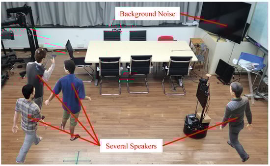 To achieve natural and effective human–robot Interaction (HRI), robots need to utilize multiple senses to communicate with humans. Among these senses, robot audition has become increasingly important in recent years. The concept of robot audition was first proposed by Nakadai et al. [] and is defined by three key abilities, (1) the ability to locate sound sources in unknown acoustic environments, (2) the ability to move actively to obtain more information about the sound and (3) the ability to continuously perform acoustic scene analysis in noisy environments. Current research on robot audition focuses on Sound Source Localization (SSL) [], Sound Source Separation (SSS) [] and Automatic Speech Recognition (ASR) []. While these techniques have become increasingly mature in single-speaker scenarios after more than two decades of development, locating and tracking a particular speaker in a noisy environment where multiple speakers are communicating simultaneously as illustrated in Figure 1 remains a challenge, and is known as the cocktail party problem []. This problem involves two challenges [], how to locate the sound of interest and how to collect a clear audio signal of the target from a variety of background noises.