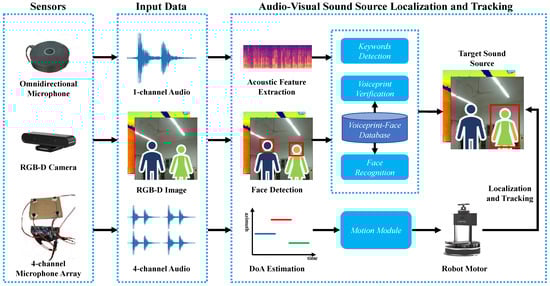The overall framework of AV-SSLT. To identify a target sound source of interest, the robot continuously collects sound signals and waits for keyword detection. Once a keyword is detected, acoustic features extracted from the sound signals and face features obtained from RGB-D images are compared with the database to identify the target. To localize and track the target speaker, the motion module controls the robot’s movement using the directions of arrival (DoA) estimated from the audio data.