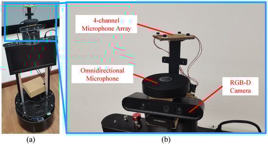 (a) The experimental platform. (b) The sensor configuration. The RGB-D camera is mounted on the head of the robot which is 1 m above the ground. The omnidirectional microphone is placed on top of the camera and the 4-channel microphone array is installed 0.1 m above the camera.