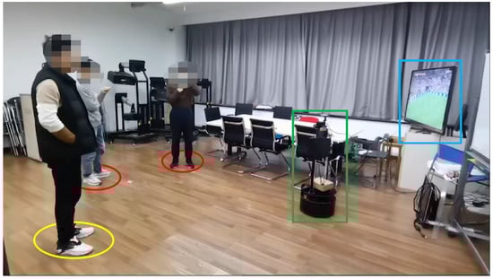 The configuration of an episode. The person marked by the yellow circle is the target speaker. The other people, identified by the red circles, are presented as the interfering sound sources. The robot highlighted by the green rectangle starts at a random position in the room. The sound from the television indicated by the blue rectangle served as the background noise.