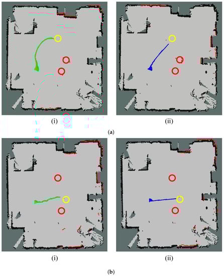 The trajectories of the robot in two different episodes. (i) The trajectory of the robot moving under the control of the motion module and (ii) the trajectory of the robot moving directly towards the sound source. The yellow circle indicates the target speaker and the red circles represent the interfering sound sources. (a) The trajectories of the robot in the situation where the target speaker was on the outside of the interfering sound sources. (b) The trajectories of the robot in the situation where the target speaker was in the middle of the interfering sound sources.