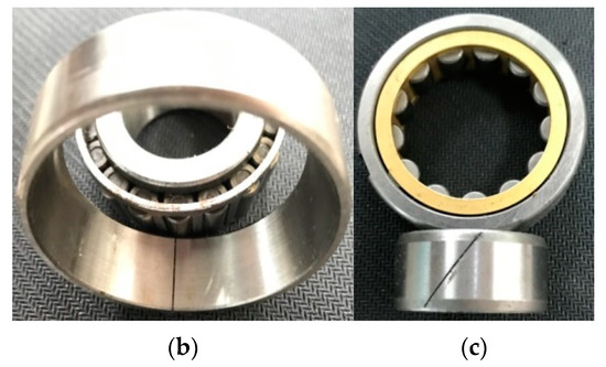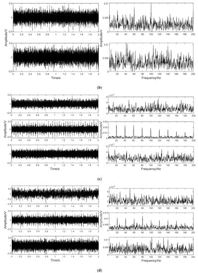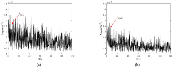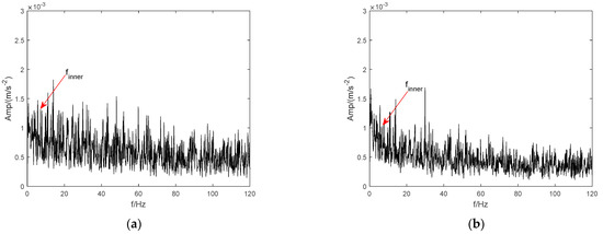 The rolling bearings are shown in Figure 12b,c. Among them, the diameter of the rolling bearing is 39.5 mm, the diameter of the rolling element is 7.5 mm, the number of rolling elements is 12, and the angle of the internal contact surface is 0 degrees. In order to effectively evaluate the operating conditions of low speed and heavy load, the radial load force applied here was set at 5000 N. The rotation speed of the inner ring is 60 r/min, and the vibration signal sampling rate is 10 kHz. Depending on the parameter calculation reference, the theoretical values of outer rings and inner rings can be calculated, and the fault signatures are listed in Table 3. The measured vibration signals of the bearing inner ring fault (BIRF) and bearing outer ring fault (BORF) are shown in Figure 13.