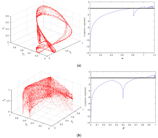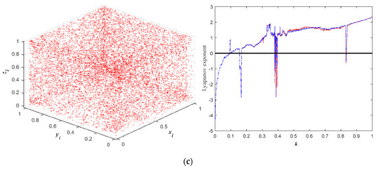 Chaotic orbits and LEs of 3D composite mapping. (a) 3D LCCM, (b) 3D SLCM, and (c) 3D LSCCM.