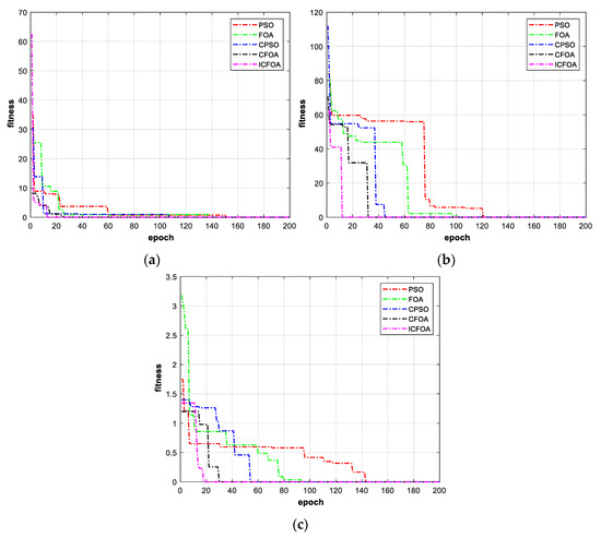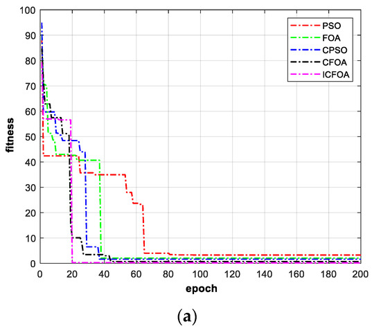 For evaluation functions in Equation (12), the proposed ICFOA has the advantage of few iterations and a rapid convergence rate. In addition, in order to verify the reliability and stability of the compared algorithms, all algorithms were run 100 times with different random time periods to find the global optimum solution. The experimental effects are presented in Table 1. Significantly, the proposed ICFOA falls into the local optimum value less than other methods in the process of searching for a global optimal solution 100 times repeatedly. By analyzing the inherent characteristics of the FOA, it can be inferred that the random coordinate induced by the FOA cannot traverse the entire space, and the method may fall into the local optimum. It is worth noting that chaotic maps have the advantages of original value sensitivity and space ergodicity, which can ameliorate such drawbacks to some extent. Therefore, the proposed ICFOA method can effectively escape from the local optimum and has good reliability and stability.