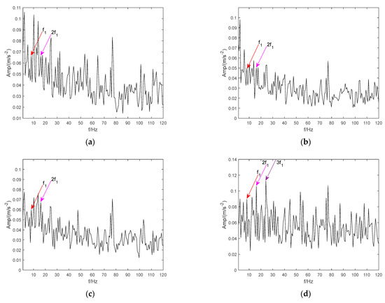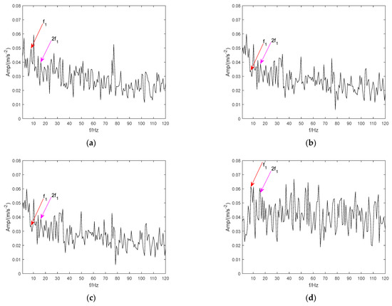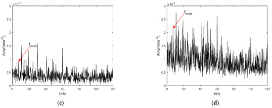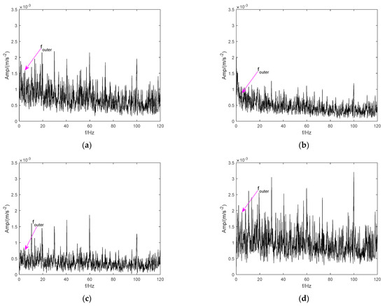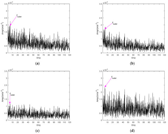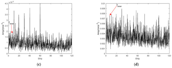 As shown in Figure 8a–d, the fault representation and its doubling frequency corresponding to CEMD, LMD, ITD, and VMD are very blurry and low amplitude. Some larger interference frequency components are distributed in the dual frequency band. Compared with other methods, VMD has some advantages in characteristic amplitude, but it is also very weak. Moreover, some signal spectra are completely submerged. The experiments show that when the SNR is low, the above methods lack the ability to extract fault characterization directly.