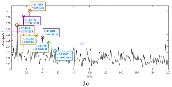 The original vibration signal and noise-added signal are shown in Figure 7a,b, respectively. When Gaussian white noise was applied to the pure pulses shown in Figure 7a, the simulated impulse signal was completely submerged by the interferences. The construct signal shown in Figure 7b was simulated to evaluate the actual early fault signal of the bearing properly. Then, the mixed signal was evaluated by CEEMD, LMD, VMD, and ITD, separately. The operation parameters of these algorithms were set according to the corresponding literature. Based on these methods, the fault characteristic frequency (theoretical value 8 Hz, actual value = 8.057 Hz) and its harmonic in the frequency domain is shown in Figure 8.