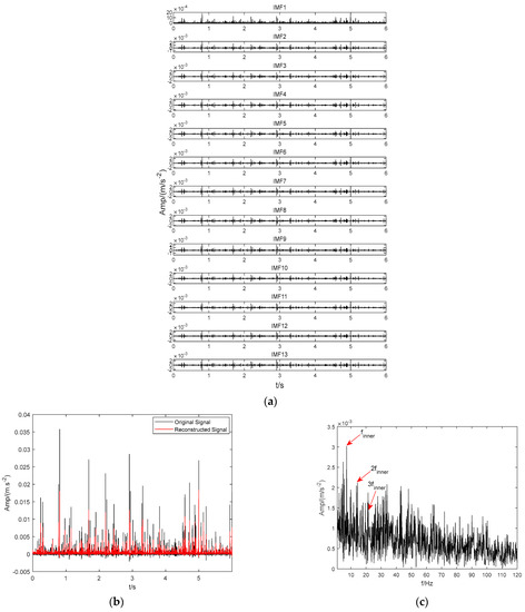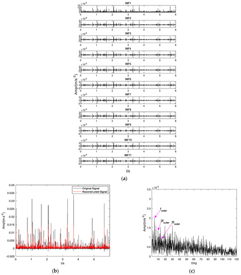 As shown in Figure 17d, by combining CTEO and VMD methods, the fault feature of the BIRF can be effectively identified. However, it is difficult to distinguish the fundamental frequency from the bi-frequency of this feature, and there is still a large amount of the interference component mixed in the spectrum. Figure 18d shows a similar spectrum distribution to Figure 17d. The reasons for this mainly involve two aspects: (1) The early fault features are severely sparse and faint, nearly overwhelmed by background noise and interference components; (2) The VMD parameters are not optimal. Therefore, in this study, the ICFOA was used to obtain the most suitable combined values of VMD, following the same procedure as described in Section 3. In addition, the parameters related to the chaotic mapping and FOA remained unchanged, except that the VMD update step needed to be manually set based on the standard deviation of the raw fault. Firstly, the optimal combination values of VMD searched by the ICFOA were = [13, 3175] and = [11, 2406], and the obtained parameters were saved for each. Then, the optimal approach was used to analyze the BIRF and BORF signals excited by the bearing in Figure 16a and b, respectively. The BIRF signal was decomposed into 13 IMFs (Figure 19a), and the corresponding kurtosis values of each IMF component were 20.1, 22.6, 20.8, 22.7, 22.2, 21.1, 23.1, 16.9, 18.7, 21.6, 24.2, 22.3, and 31.4. The mean kurtosis value is 22.1. The BORF signal was decomposed into 11 IMF components (as shown in Figure 20a), and the corresponding kurtosis values for each IMF component were 14.6, 18.7, 16.4, 20.8, 17.5, 16.2, 18.2, 16.5, 15.2, 17.2, and 24.5, with a mean kurtosis of 17.8. Then, the kurtosis of each IMF component was calculated, the corresponding IMF component with a kurtosis larger than the mean value was selected, and a fresh signal was reconstructed. The reconstructed representations are shown in Figure 19b and Figure 20b. Finally, the envelope spectra of the two reconstructed signals were solved. The final effects are illustrated in Figure 19c and Figure 20c. As shown in Figure 19c, the fault representation (7.17 Hz) and its second harmonics (14.34 Hz) of the BIRF reconstructed signal are effectively extracted, and the interference components are obviously reduced. Similarly, from Figure 20c, the fundamental frequency (4.88 Hz) and double frequency (9.76 Hz) of the reconstructed fault signal can be effectively observed, and the interference spectrum is also significantly reduced. The experimental evaluations demonstrate that the proposed approach can efficiently identify fault features under excessive load and low-speed operation. Additionally, it offers a fruitful means for incipient fault diagnosis of heavy-duty and low-speed rotation equipment.