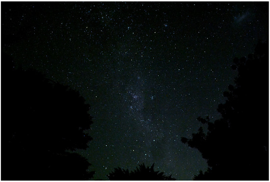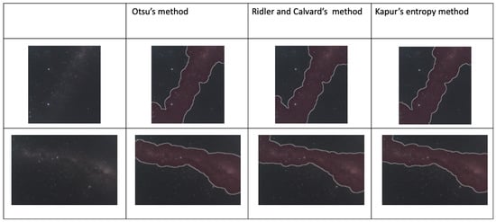 The only discernible large object in a clear, moonless night sky is the MW. This suites thresholding techniques that assume that the image contains two pixel groups, those belonging to the foreground and those belonging to the background. Because of the simple computation, robustness and adaptability, Otsu’s technique [35] is extensively used for computer vision applications. The algorithm is used to automatically determine optimal threshold values to segment the background from the foreground area [36,37]. Figure 8 shows a comparison of two additional common thresholding techniques, Ridler and Calvard’s method [38] and Kapur’s entropy method [39]. All three popular image-thresholding approaches achieve similar results in this situation.