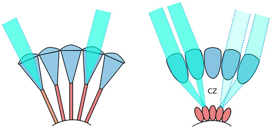 Simplified depiction of apposition (Left) and superposition (Right) compound eyes. The clear zone (cz) found in superposition eyes is labelled. Illustration adapted from [11].