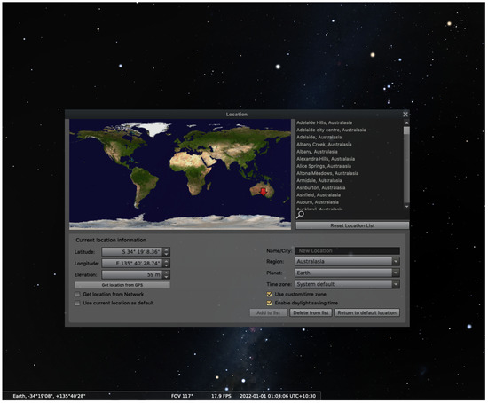 There are several key settings in Stellarium that we used in this paper: date, location, MW brightness/saturation, light pollution level (LP), etc. The following image, Figure 4, shows an example of the latitude and longitude settings.