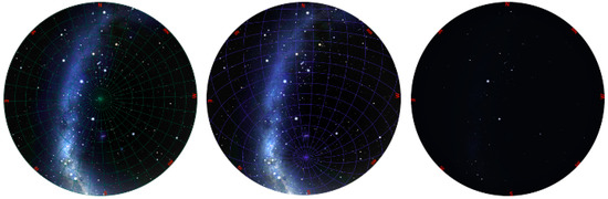 As discussed above, Stellarium allows for sufficient parameter settings to provide a more flexible way to create night sky images. However, this software cannot create real-time weather environments such as cloud conditions for the simulated sky images; thus, we only considered the clear night sky with different light pollution levels.