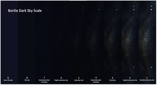 - Bortle, J.E. The Bortle Dark-Sky Scale. In Sky and Telescope; 2001; Available online: https://skyandtelescope.org/wp-content/uploads/BortleDarkSkyScale.pdf (accessed on 15 January 2023).