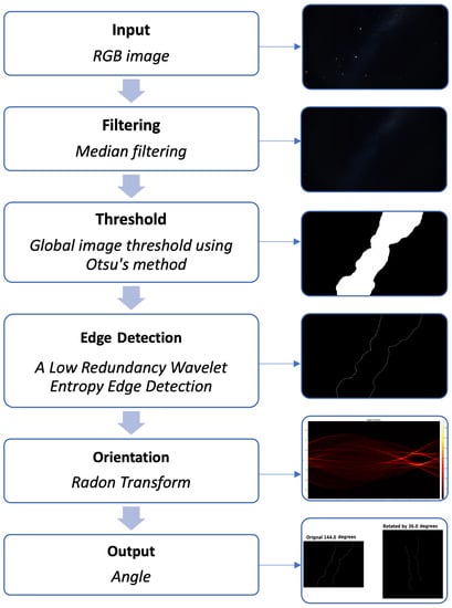 It is well established that the brightness variation in the sky caused by the MW is responsible for the orientation behaviour of the S.satyrus dung beetles [18,34], but the actual neural computation involved is not exposed by the behaviour. In this section, we present the development steps of the computer vision method presented in Algorithm 1 that we have developed to extract direction information under low light levels of this large but low-contrast celestial landmark. The objective of the method is to reduce the image to an angle representing the orientation of the MW. The proposed method consists of the distinct steps shown in Figure 7.