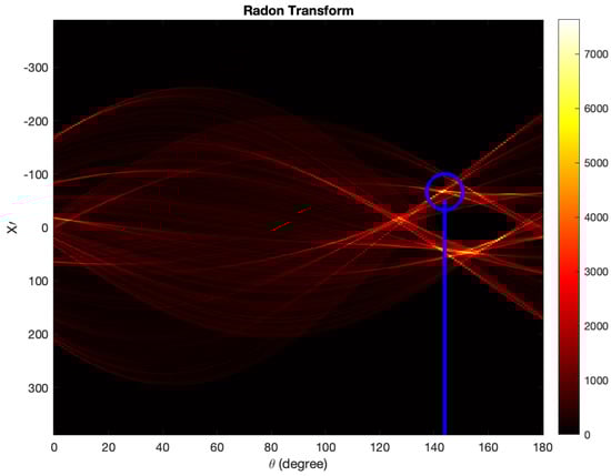As discussed above, the Radon transform for each calculates the total intensity of the specific line that pairs the parameters. In other words, the maximum value of the Radon transform corresponds to the location of maximum intensity of the straight line in our detected MW area. The Radon transform was implemented by using the radon function in MATLAB, and the angle was computed at angles from 0° to 180°, in 1° increments. In this study, the implementation of the Radon transform ensures that angle outputs are integer degrees, which limit the resolution of results. Figure 12 shows the location of the peak of the Radon transform and displays a circle over the maximum.