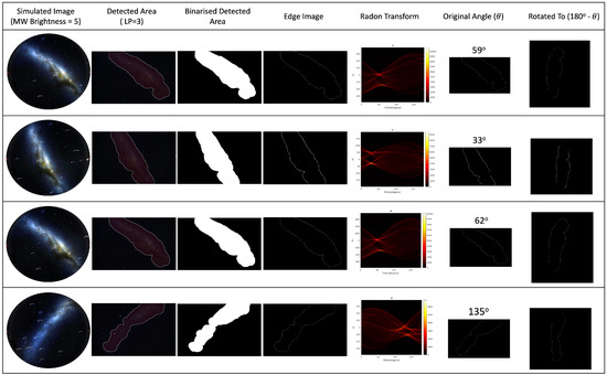 First column: In order to illustrate the results clearly, this column shows the MW with increased brightness (Stellarium MW brightness set as 5). 2nd–7th columns: Detection and angle calculation results for simulated sky images. The light pollution level for the test images is 3.